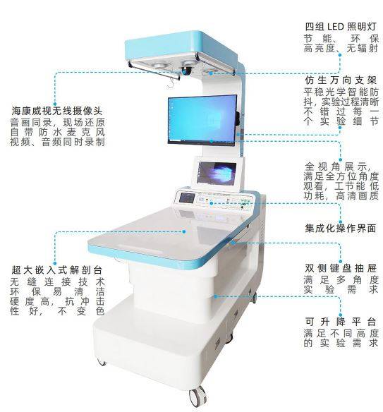 4.顶部有4组LED照明等和集成高保真音响系统。还包含有万向调节支架,放置高清摄像机系统和大屏高清显示器。
